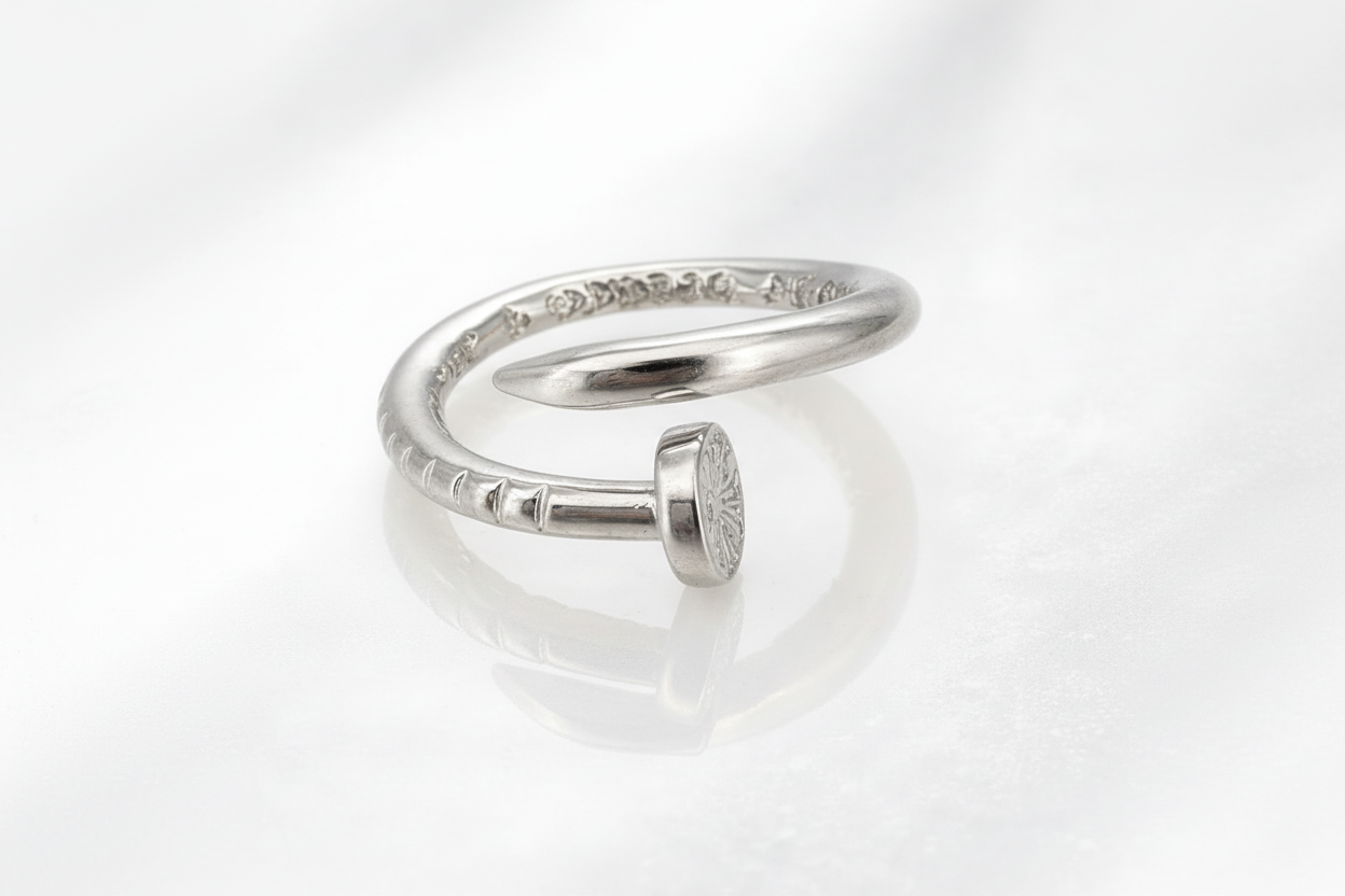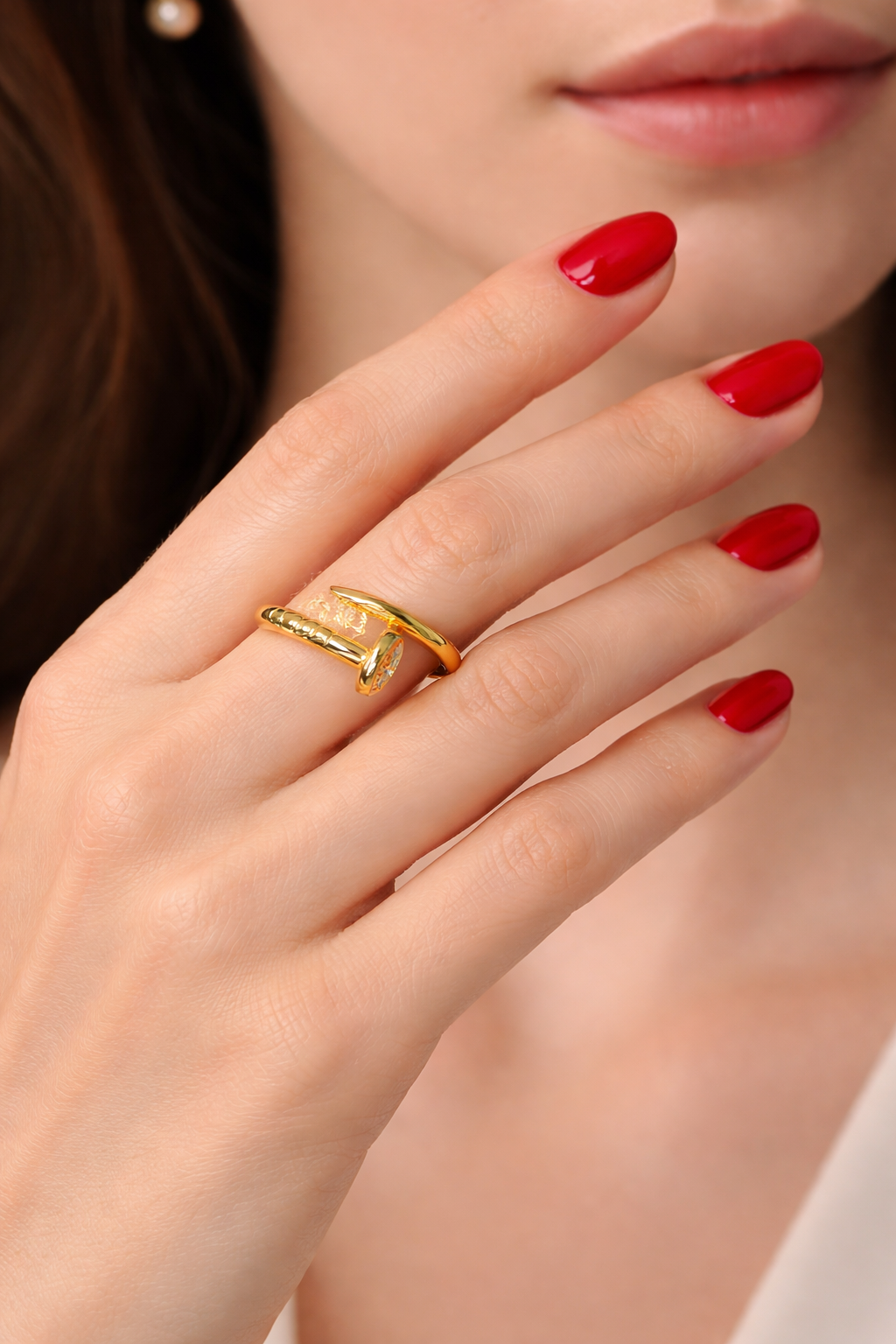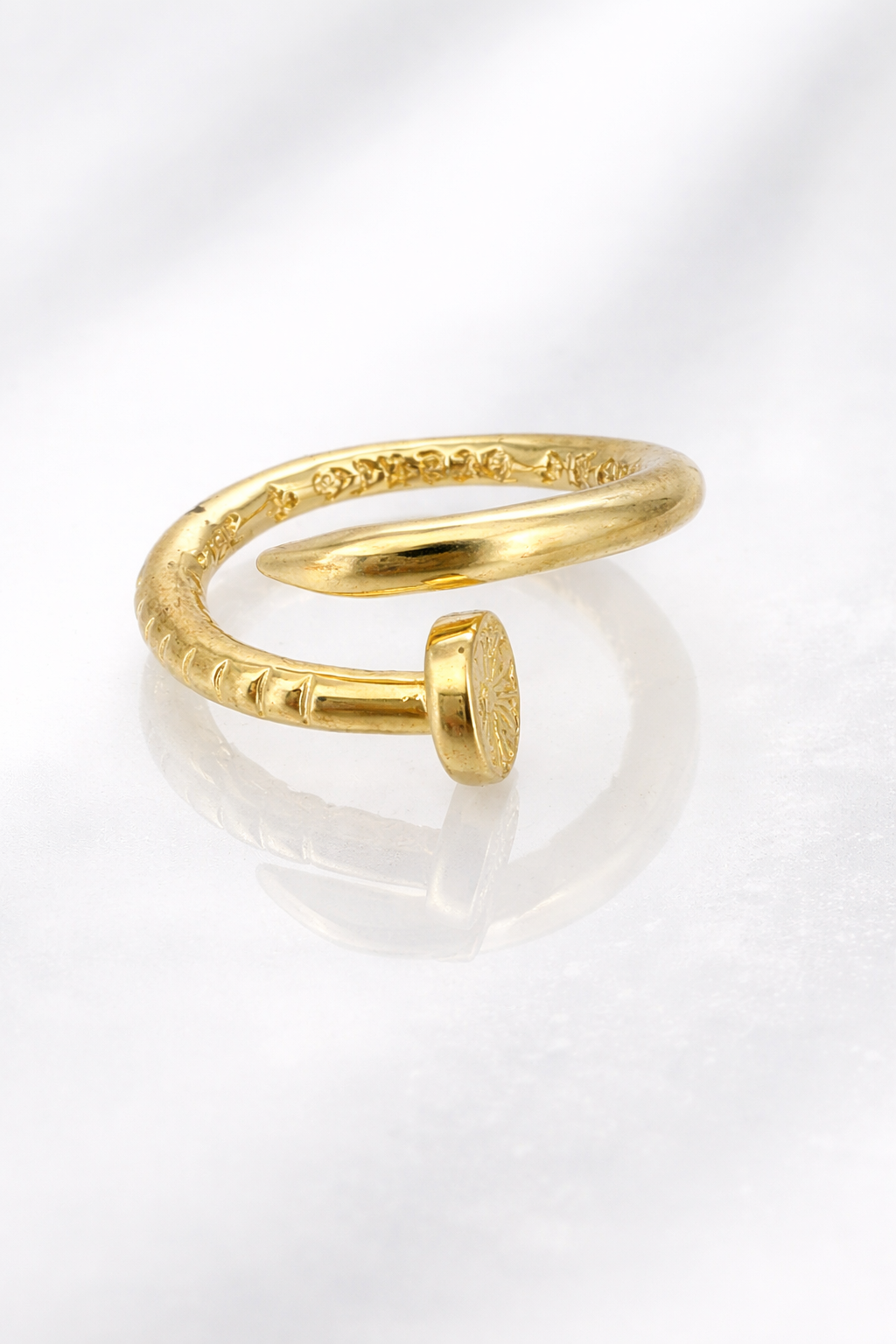 Anillo abierto de inspiración contemporánea con silueta tipo clavo, símbolo de fuerza y determinación. Su acabado dorado pulido refleja la luz con intensidad y carácter, mientras su diseño envolvente aporta modernidad y estilo audaz. Una pieza minimalista pero poderosa, ideal para mujeres seguras que transforman lo simple en extraordinario.