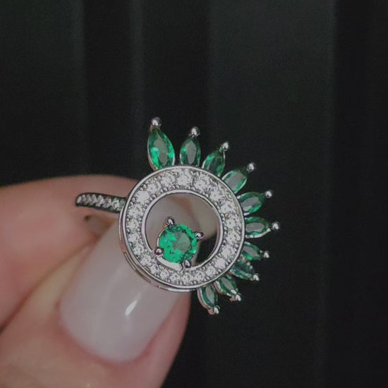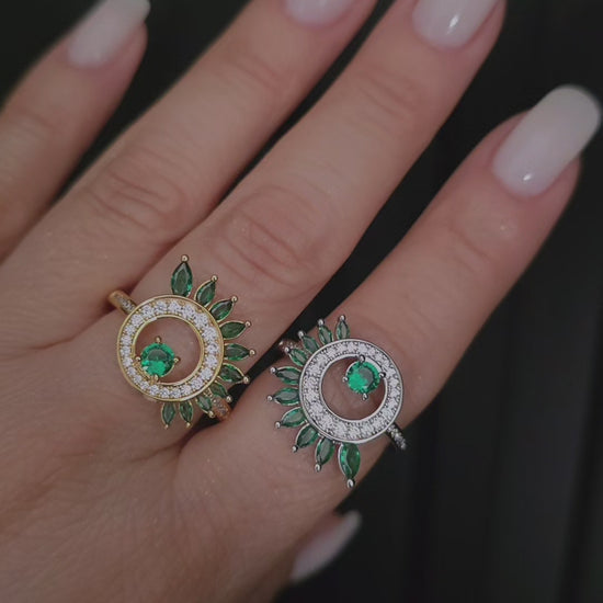 Un diseño que irradia elegancia y carácter. Este anillo bañado en oro presenta un deslumbrante cristal verde esmeralda en el centro, rodeado por una aureola de cristales pavés que aportan un brillo sofisticado. Su diseño tipo abanico, con cristales marquise en tono verde intenso, evoca la forma de un sol naciente, haciendo de esta pieza un verdadero ícono de glamour.