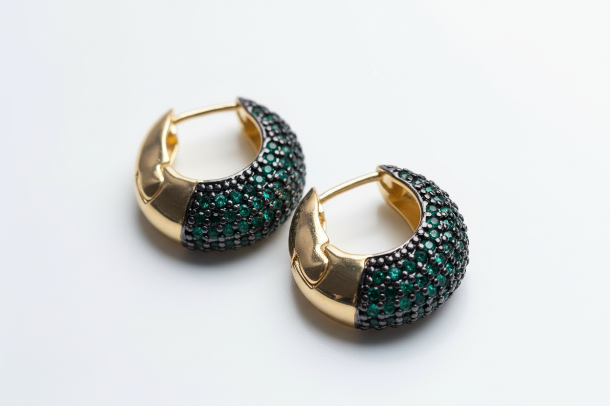 Aros tipo argolla con un diseño envolvente y sofisticado, bañados en oro y trabajados con cristales pavés engarzados uno a uno, que aportan un brillo profundo y elegante. Su forma compacta los hace cómodos y livianos para el uso diario, mientras que el contraste entre el dorado del metal y el color intenso de los cristales los convierte en una joya protagonista. Ideales para elevar cualquier look, desde el día a la noche.