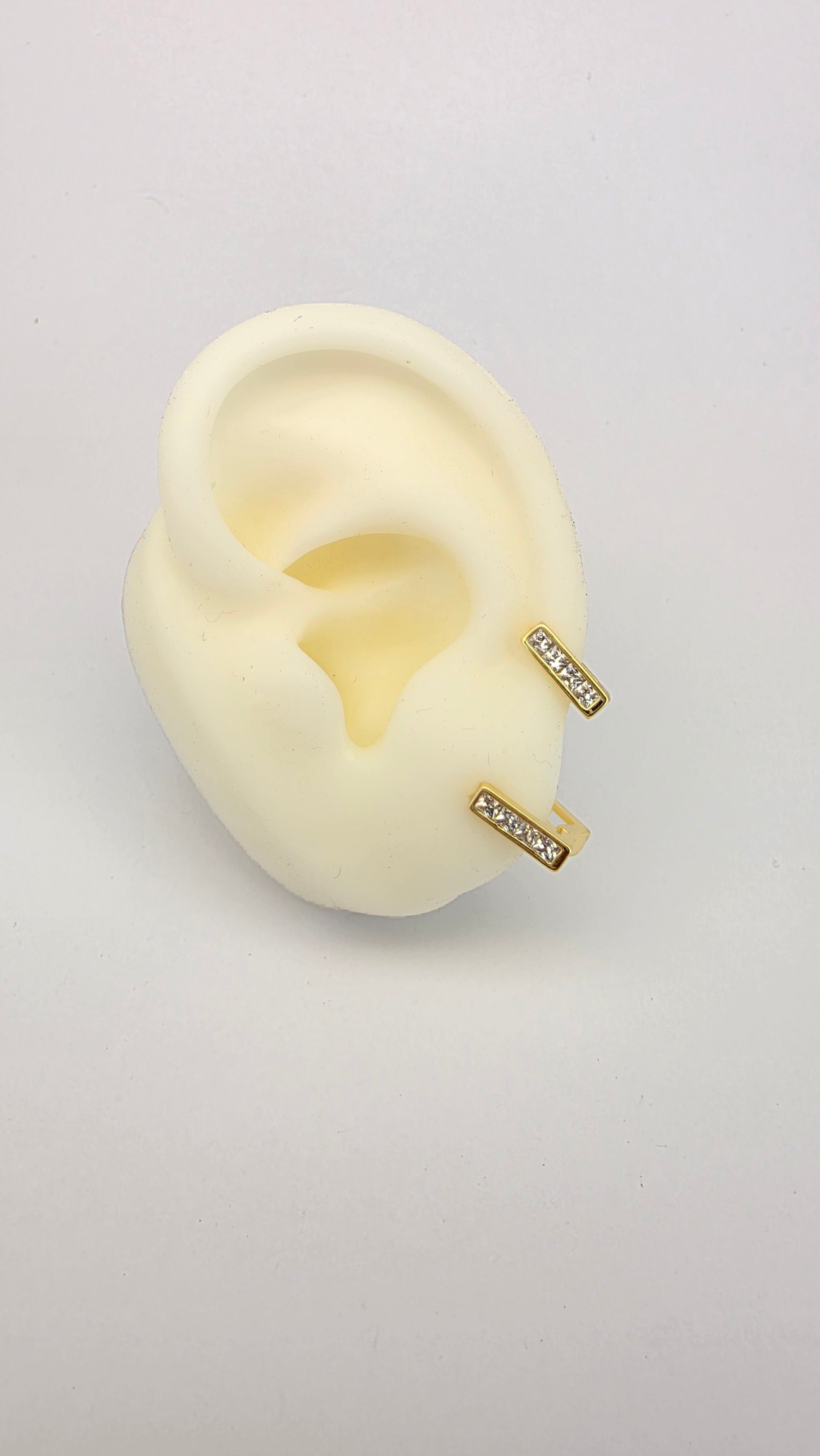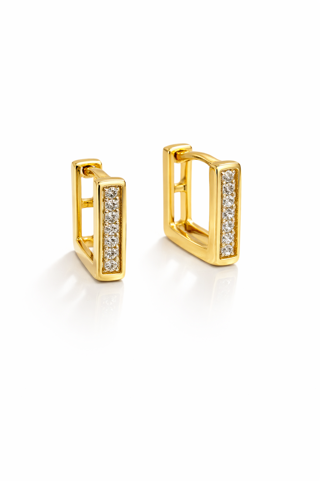 Aros pequeños de diseño geométrico y líneas rectas, bañados en oro y engarzados con cristal pavés que aportan un brillo elegante y sofisticado.