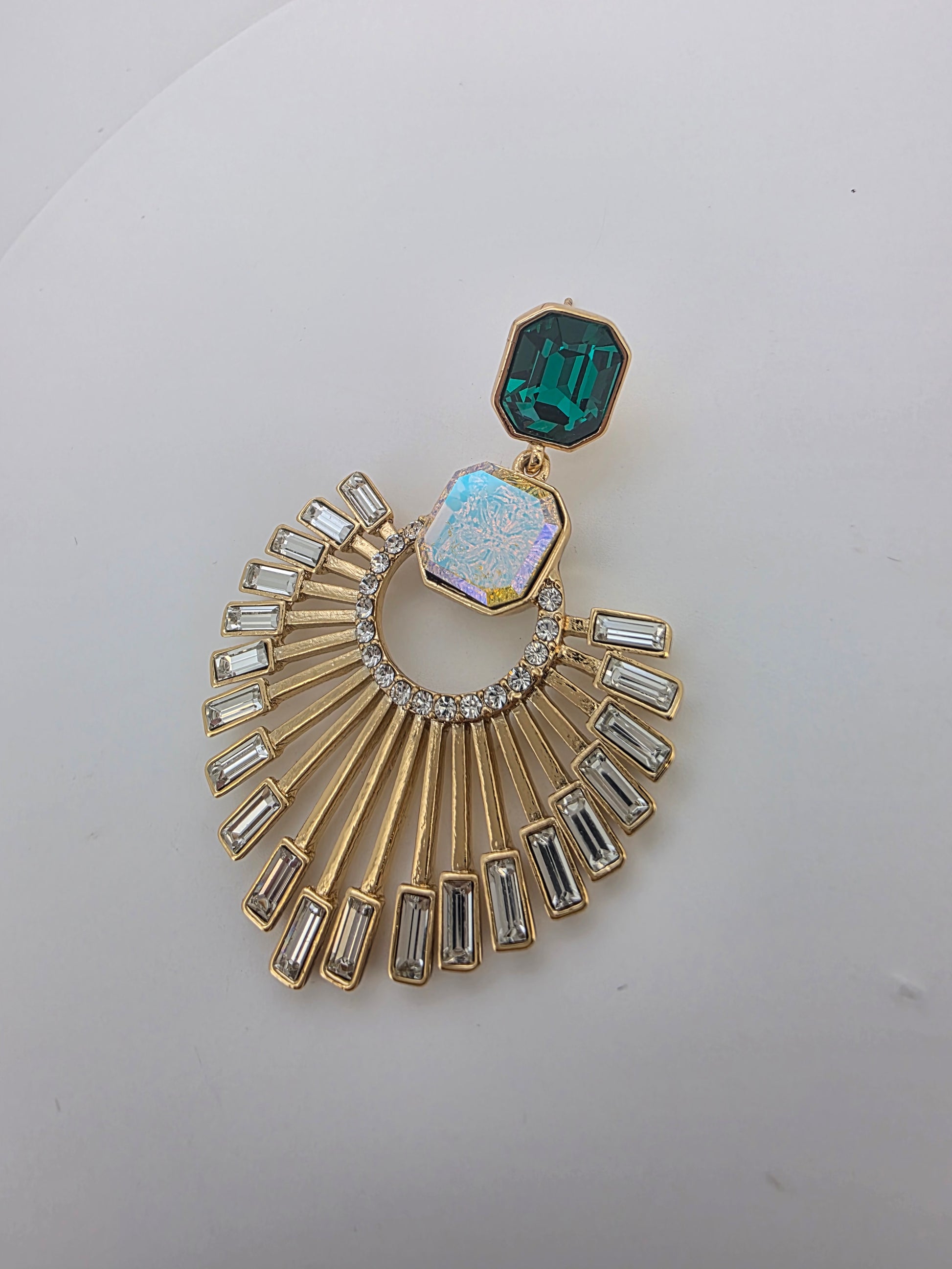 estos aros de diseño radial combinan elegancia y fuerza visual. Su estructura en forma de abanico se despliega desde un círculo central realzado con detalles brillantes, mientras que un cristal en tono esmeralda corona la pieza con un acento vibrante y sofisticado.