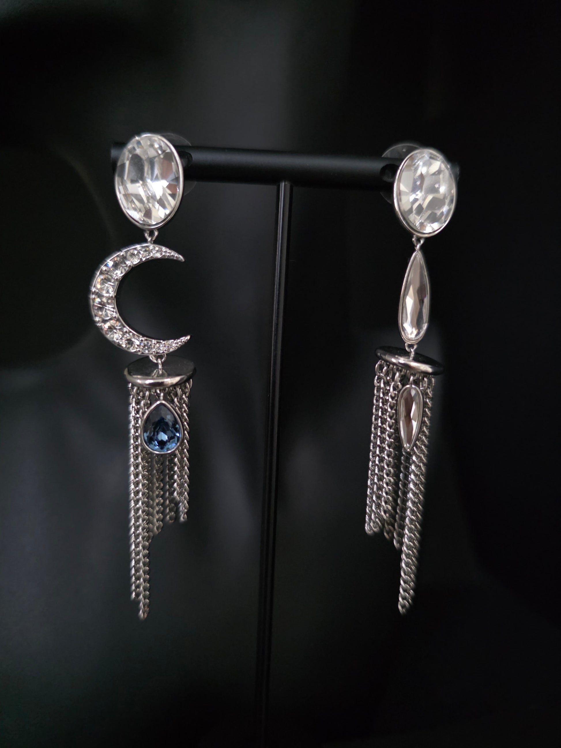 cada pieza celebra la individualidad con un equilibrio perfecto entre elegancia y originalidad. Uno de los aros destaca con un colgante de luna engarzada en cristales y una gota azul profundo, mientras que su par complementario combina formas alargadas con cadenas metálicas que aportan fluidez y sofisticación.