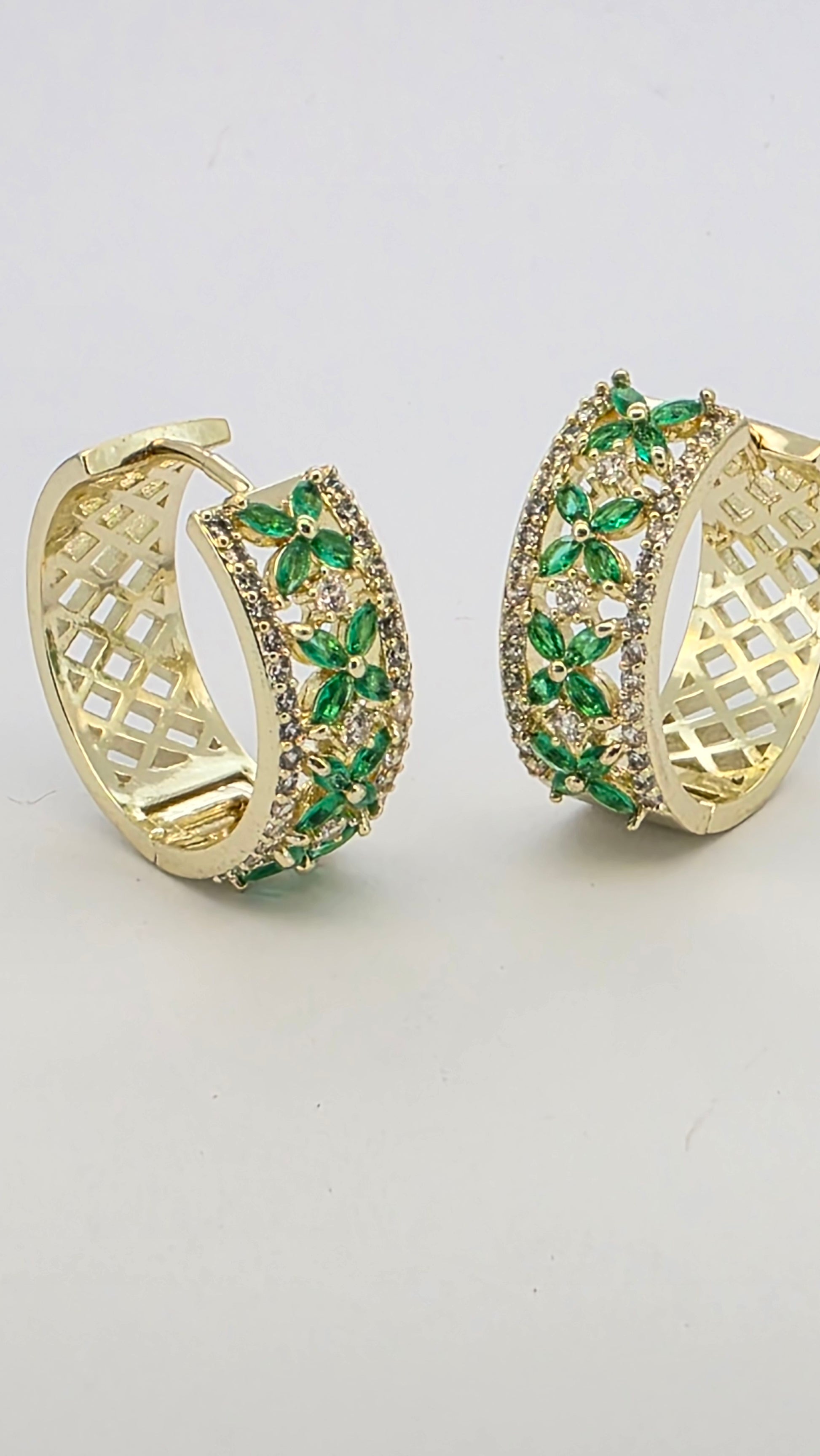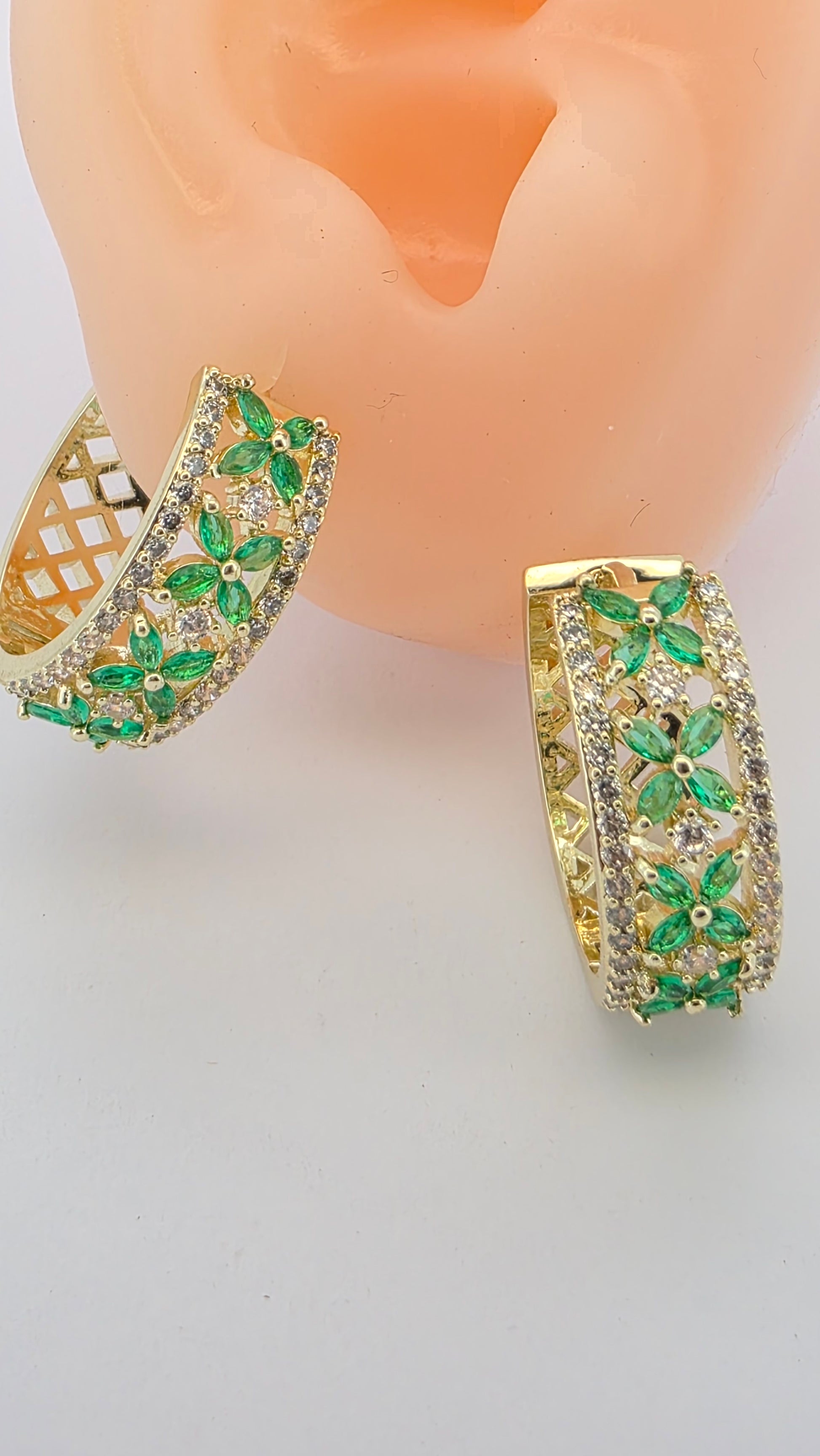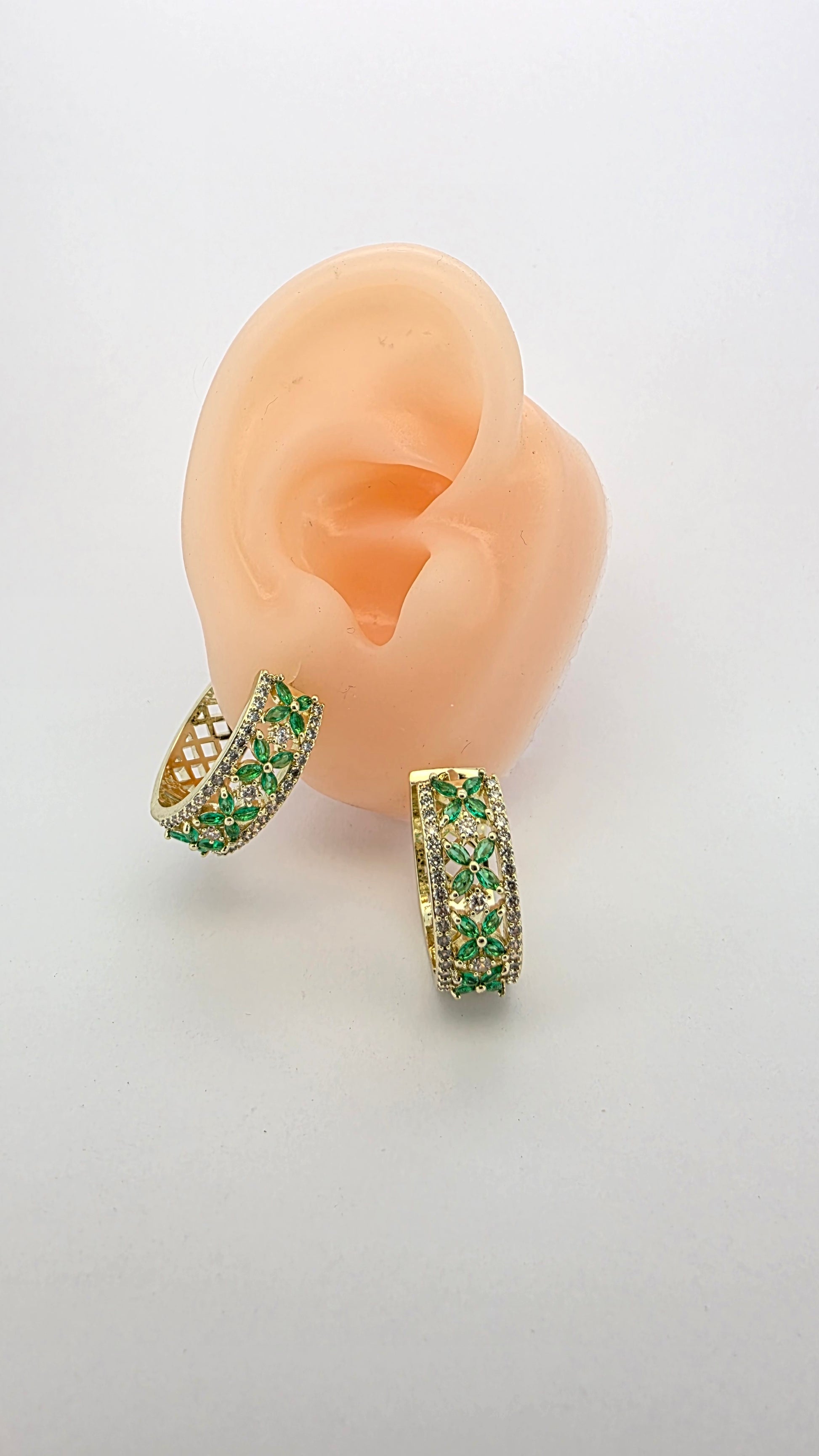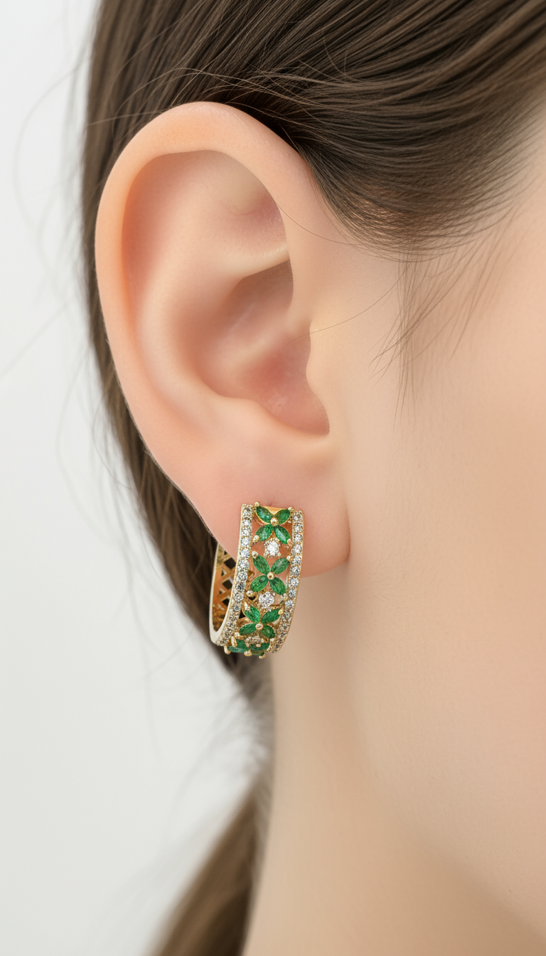 Delicados y luminosos, estos aros realzan la elegancia con un diseño floral formado por cristales pavés en tonos verde esmeralda, dispuestos con precisión sobre una base con baño de oro brillante. Cada pétalo refleja la luz con sutileza, logrando un equilibrio perfecto entre sofisticación y frescura natural.