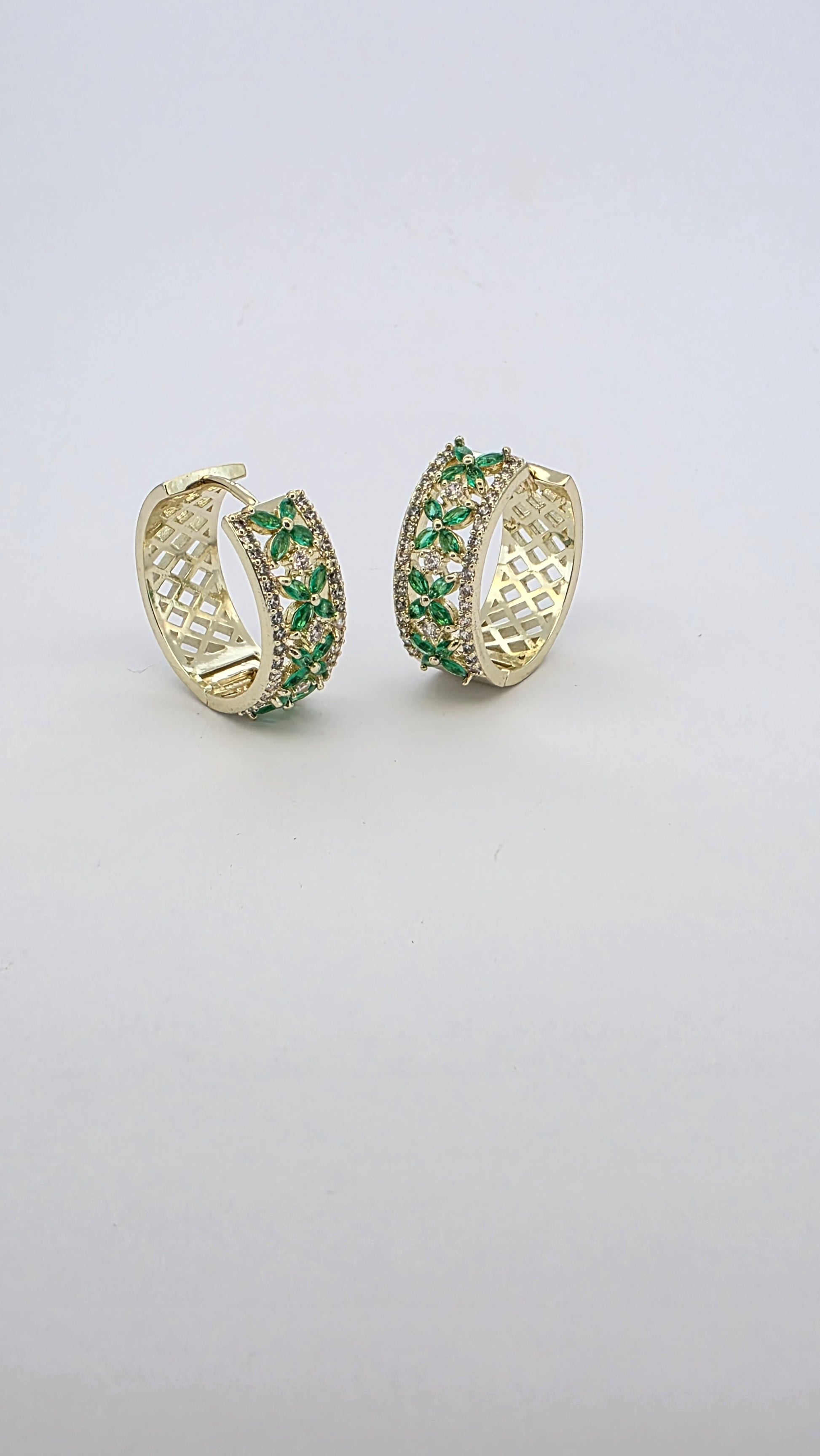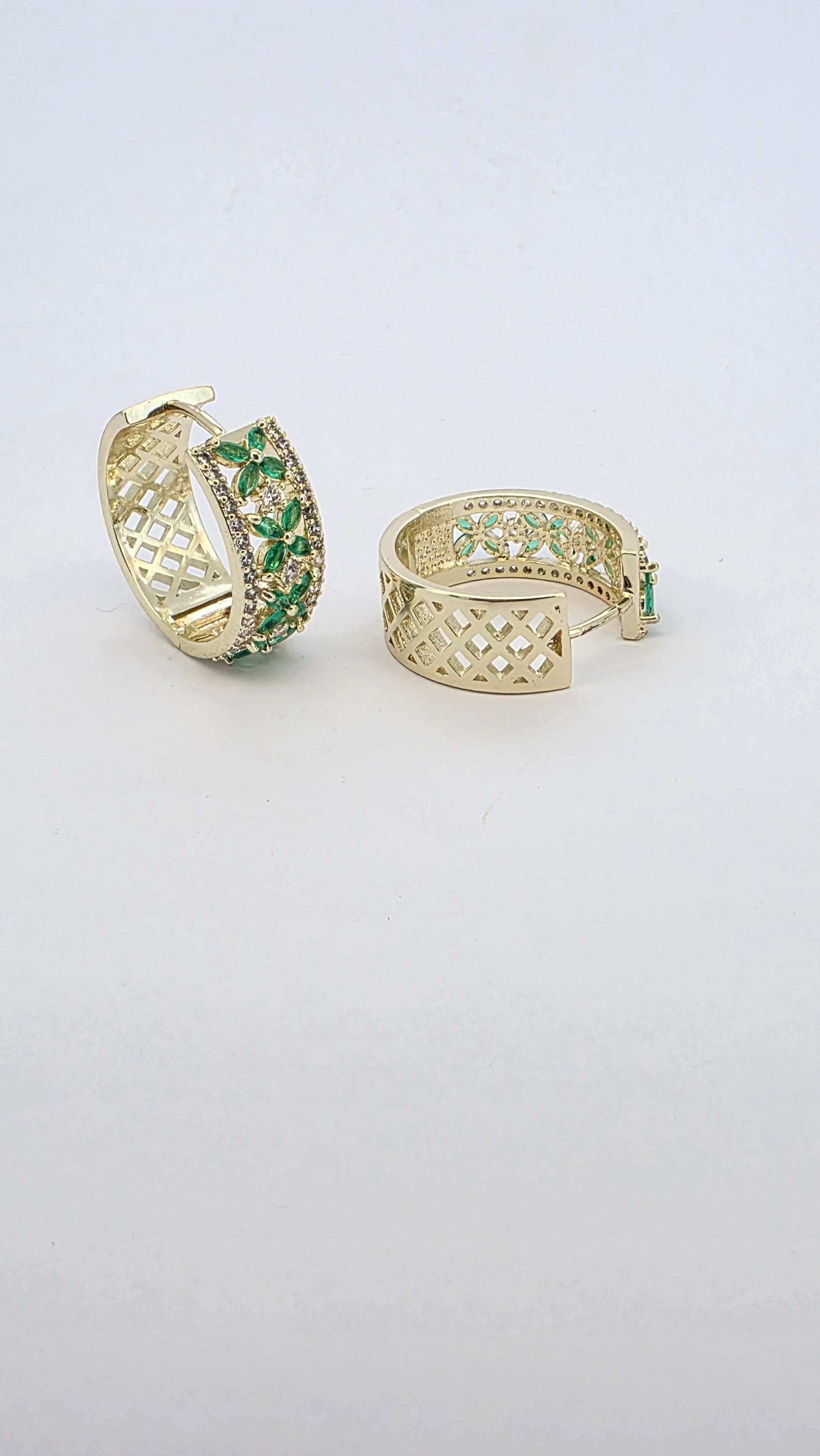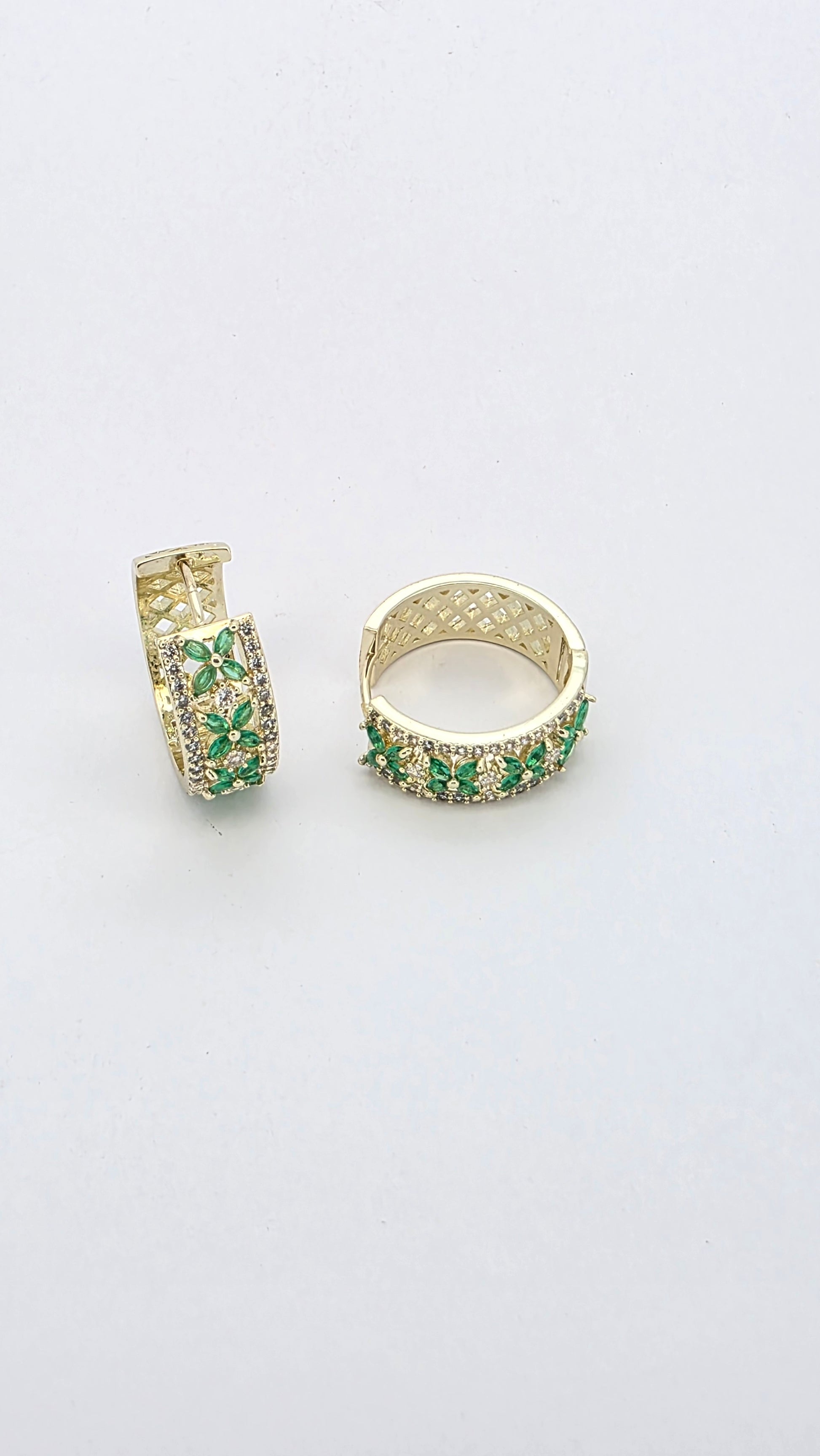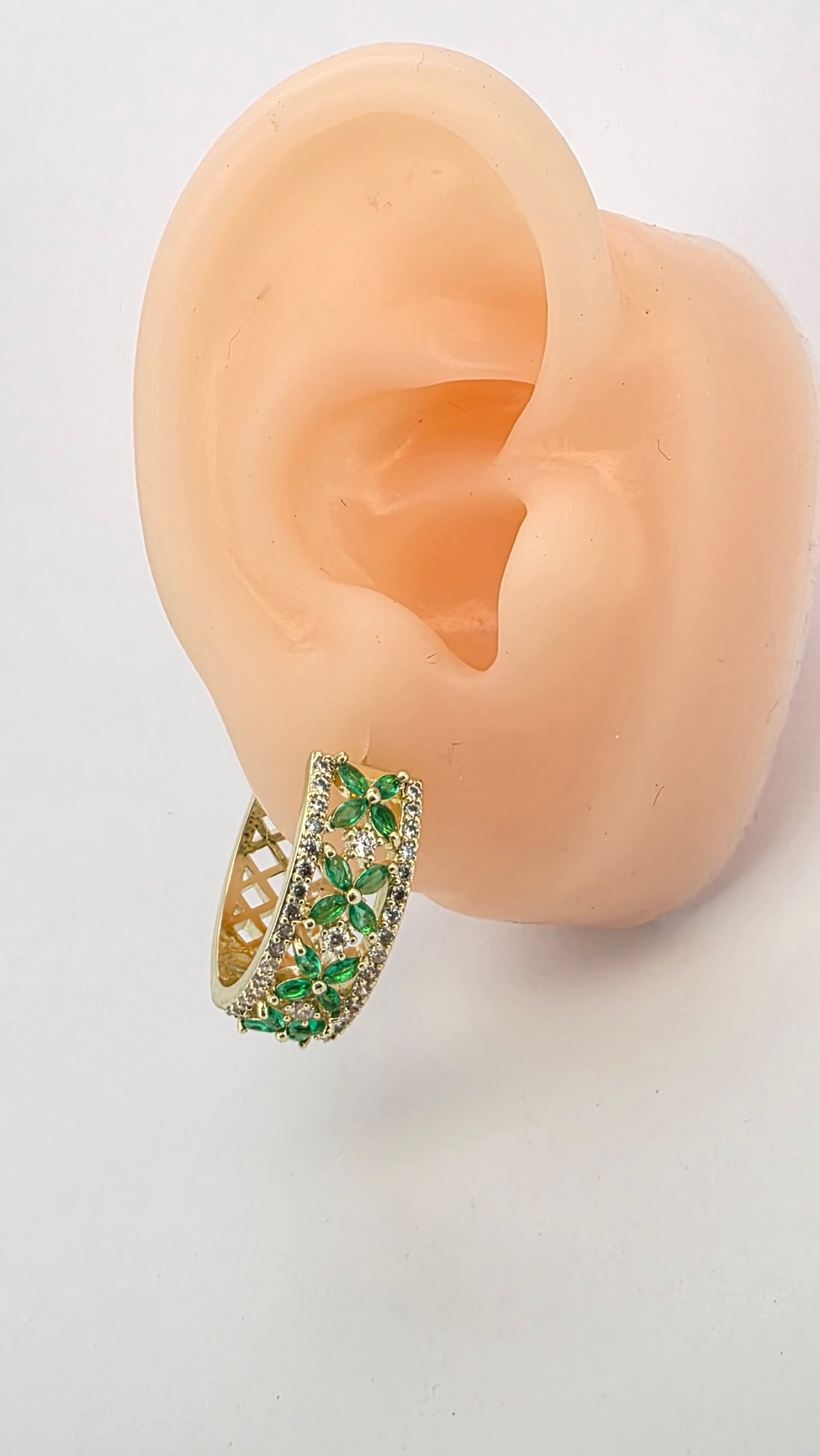 Delicados y luminosos, estos aros realzan la elegancia con un diseño floral formado por cristales pavés en tonos verde esmeralda, dispuestos con precisión sobre una base con baño de oro brillante. Cada pétalo refleja la luz con sutileza, logrando un equilibrio perfecto entre sofisticación y frescura natural.