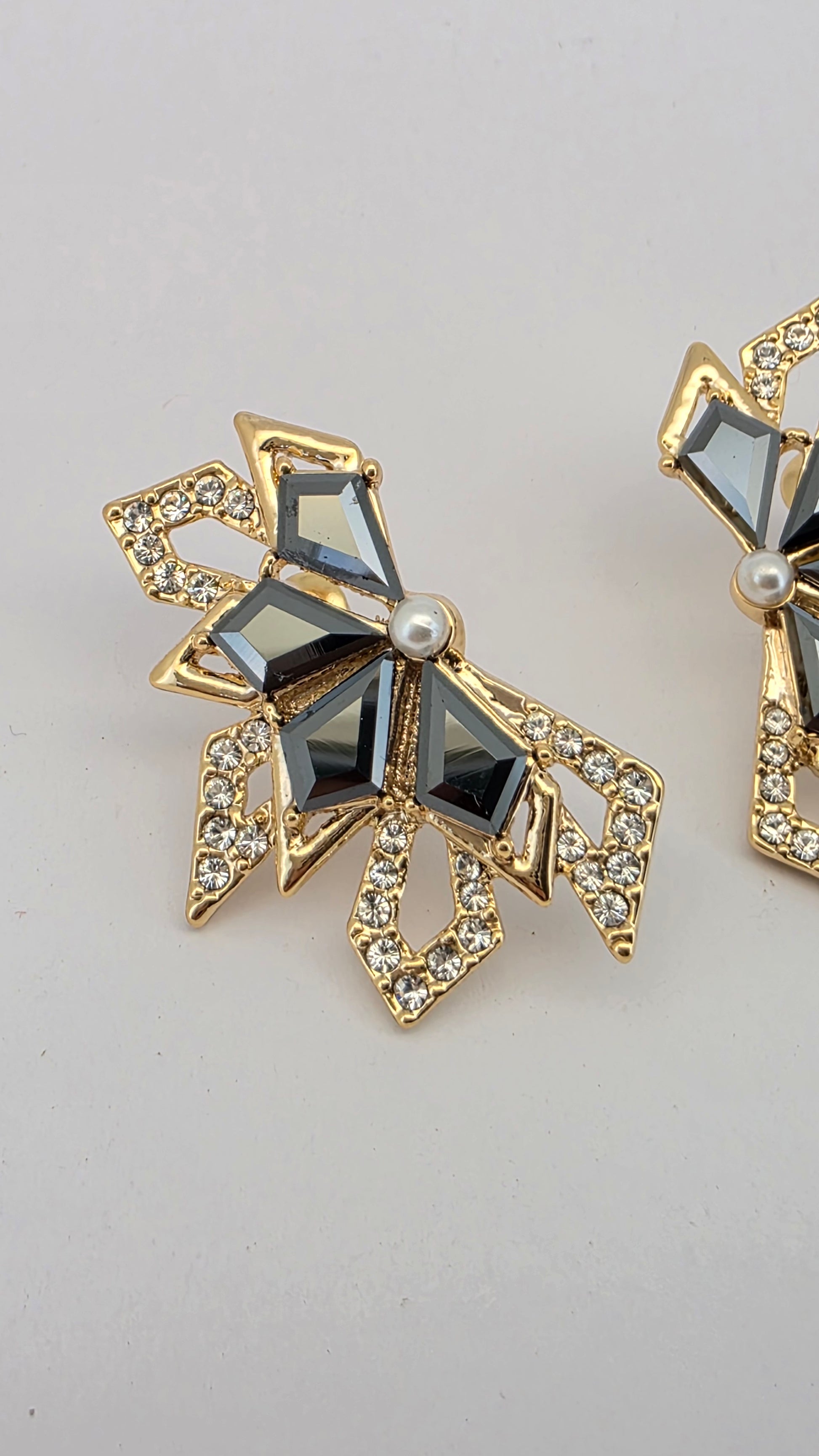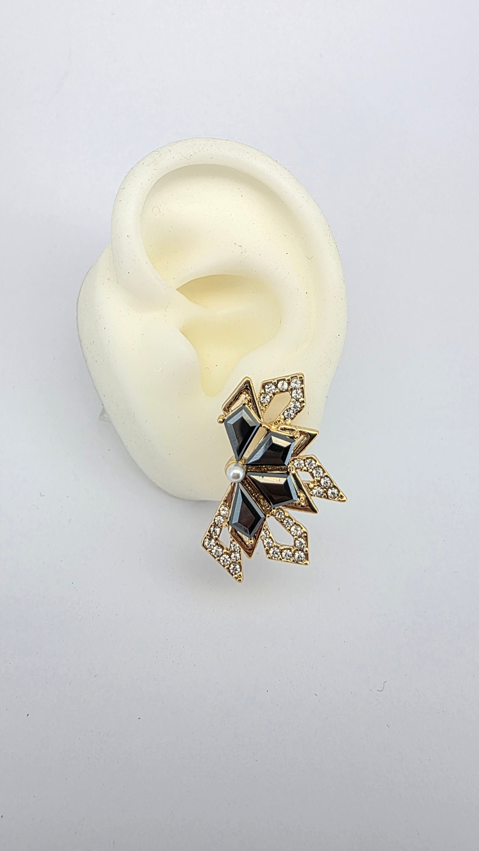 Diseño sofisticado y vanguardista que combina la elegancia del dorado con la profundidad del cristal negro genuino Swarovski. Su estructura geométrica, adornada con cristales pavé enmarcados en baño de oro, crea un efecto de brillo y contraste único. En el centro, una delicada perla acentúa su distinción y equilibrio visual.