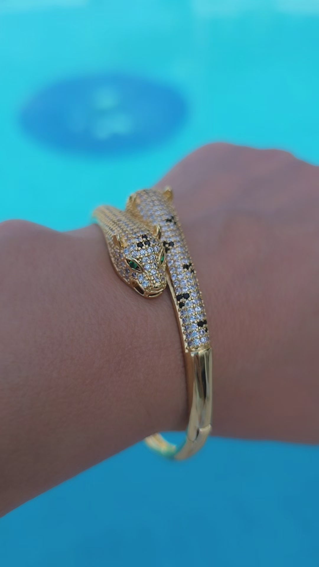 Pulsera rígida de diseño icónico con silueta felina, elaborada en cristal pavé engarzado uno a uno, con terminación bañada en RodiO, que aporta un brillo intenso y una presencia elegante y sofisticada; una joya de carácter, poderosa y atemporal, ideal para quienes buscan una pieza protagonista dentro del universo Aura.