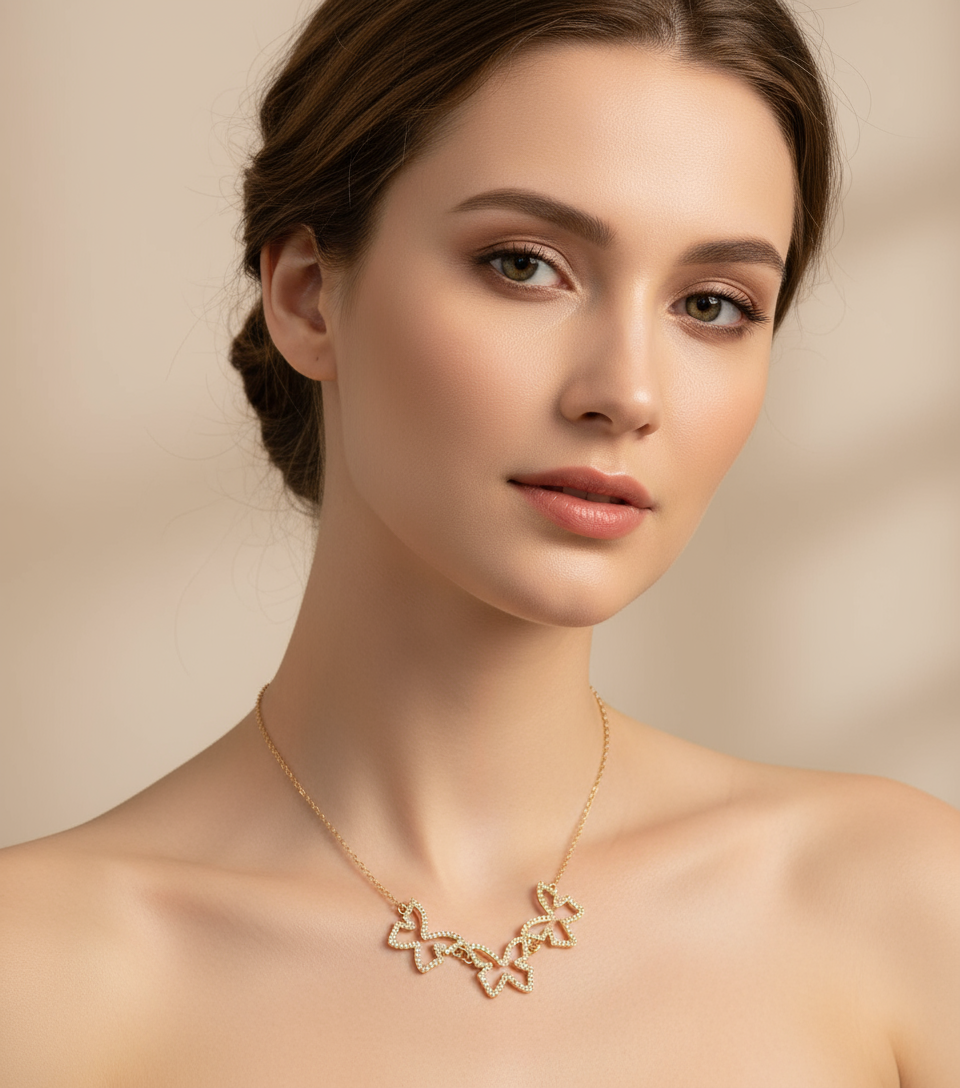 Colgante diseñado con Mariposas y cristales en pavés y baño de rodio.
