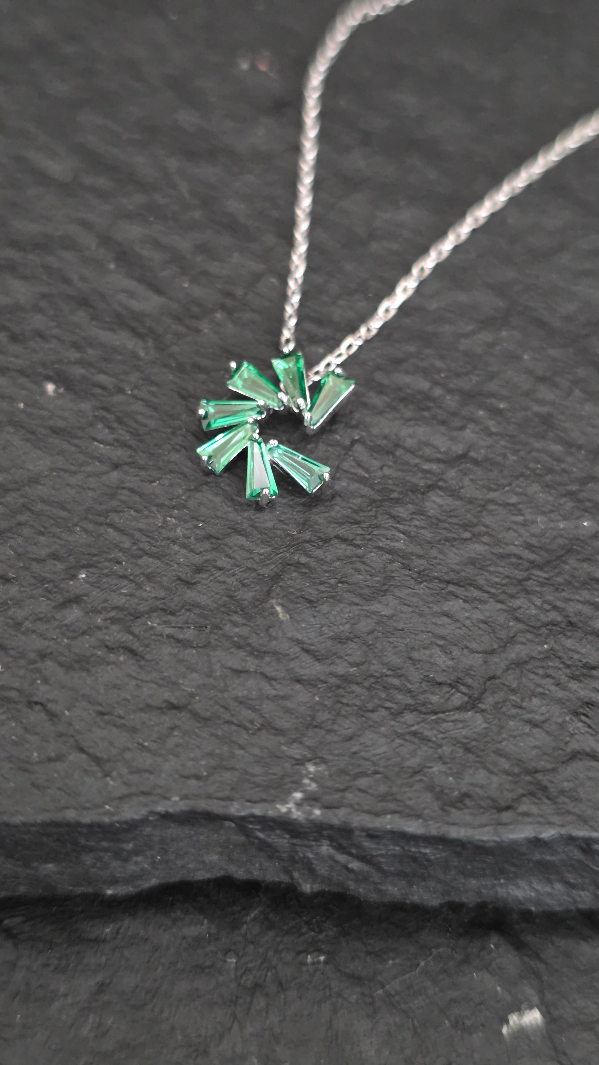 Un diseño delicado y lleno de luz. Este collar está elaborado en plata 925, con un colgante compuesto por cristales pavés en tono verde esmeralda, creados para ofrecer un brillo superior y una elegancia incomparable.