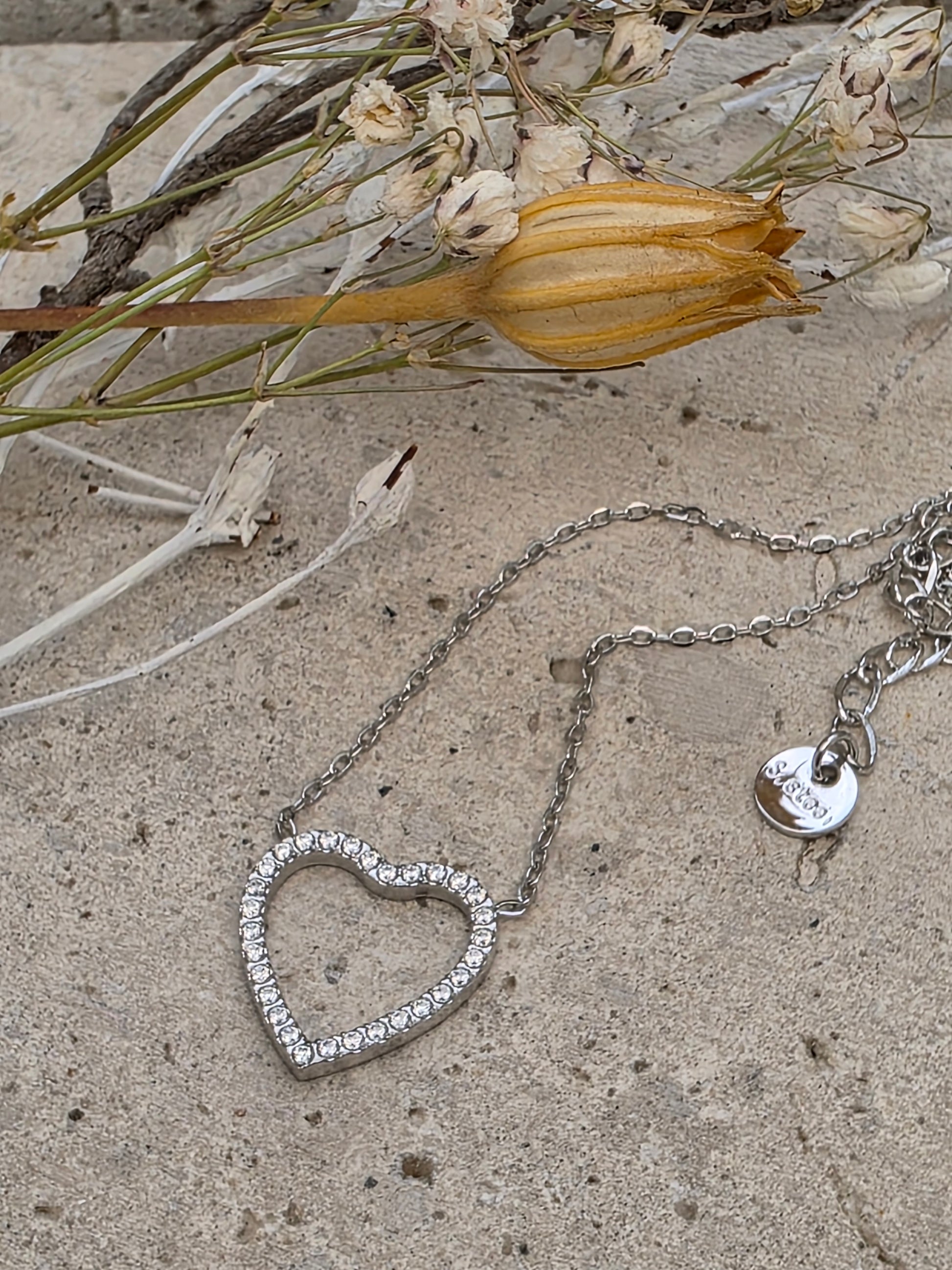 Un diseño delicado y lleno de simbolismo. Este collar está elaborado en acero quirúrgico de alta calidad, hipoalergénico y resistente, ideal para uso diario. Su colgante en forma de corazón está finamente delineado con cristales pavé que capturan la luz desde todos los ángulos, generando un brillo sutil y elegante.