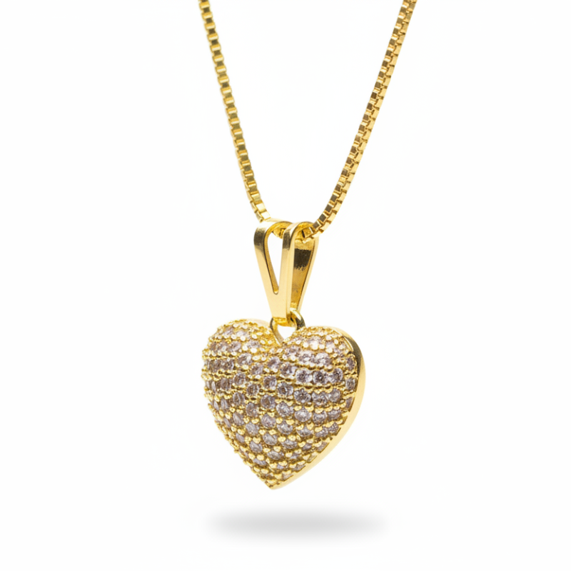 Collar delicado con colgante de corazón pequeño, completamente cubierto de cristal pavés, engarzado uno a uno para lograr un brillo sutil y elegante.