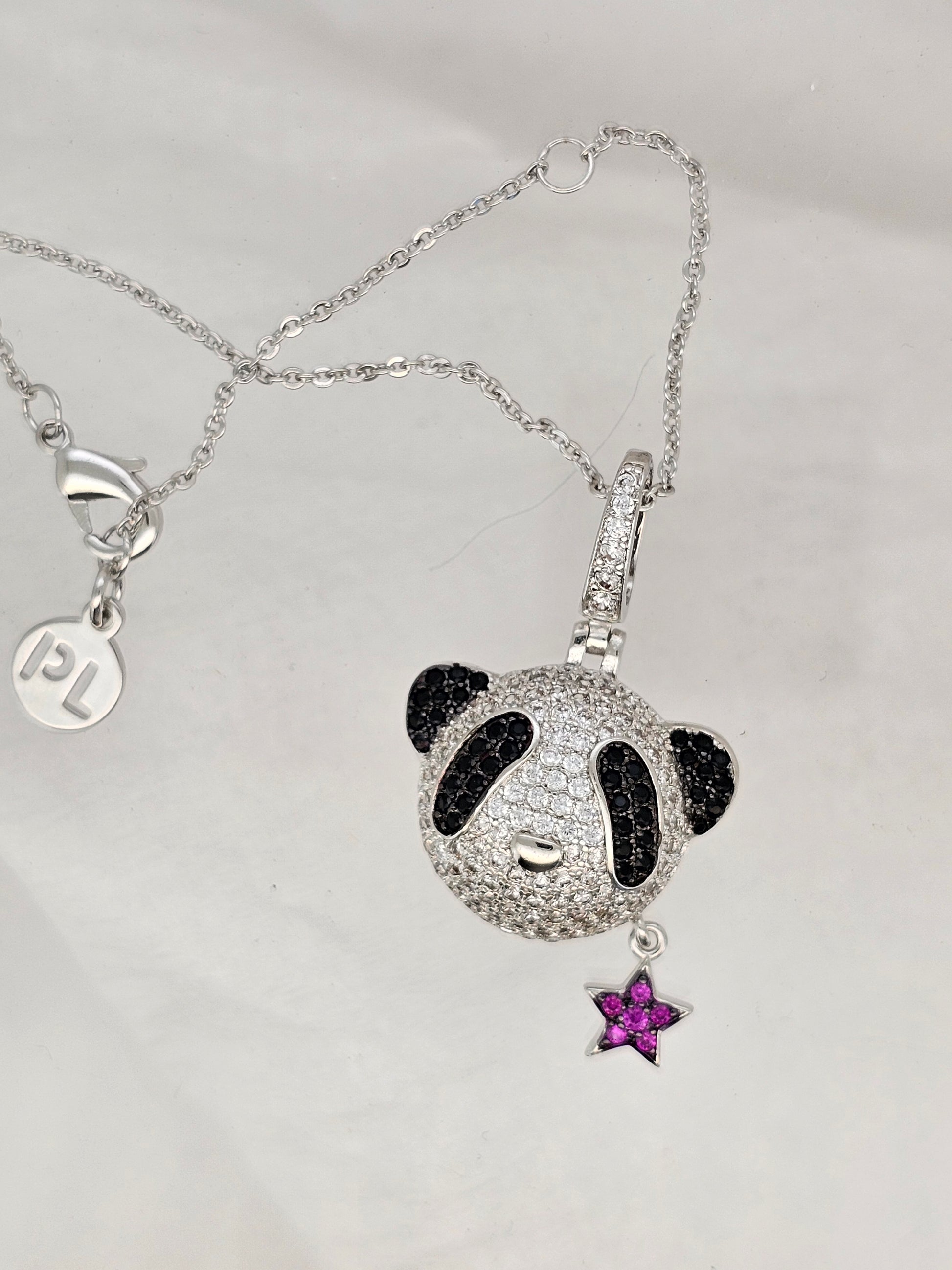 Collar de diseño exclusivo con dije de oso panda, elaborado en metal con baño de rodio de alta calidad. El colgante está completamente engastado con cristales pavé negros y blancos, que crean un contraste elegante y brillante. Una pequeña estrella colgante con cristales fucsias añade un toque lúdico y sofisticado al diseño. Pieza hipoalergénica, ideal para destacar con estilo y originalidad.