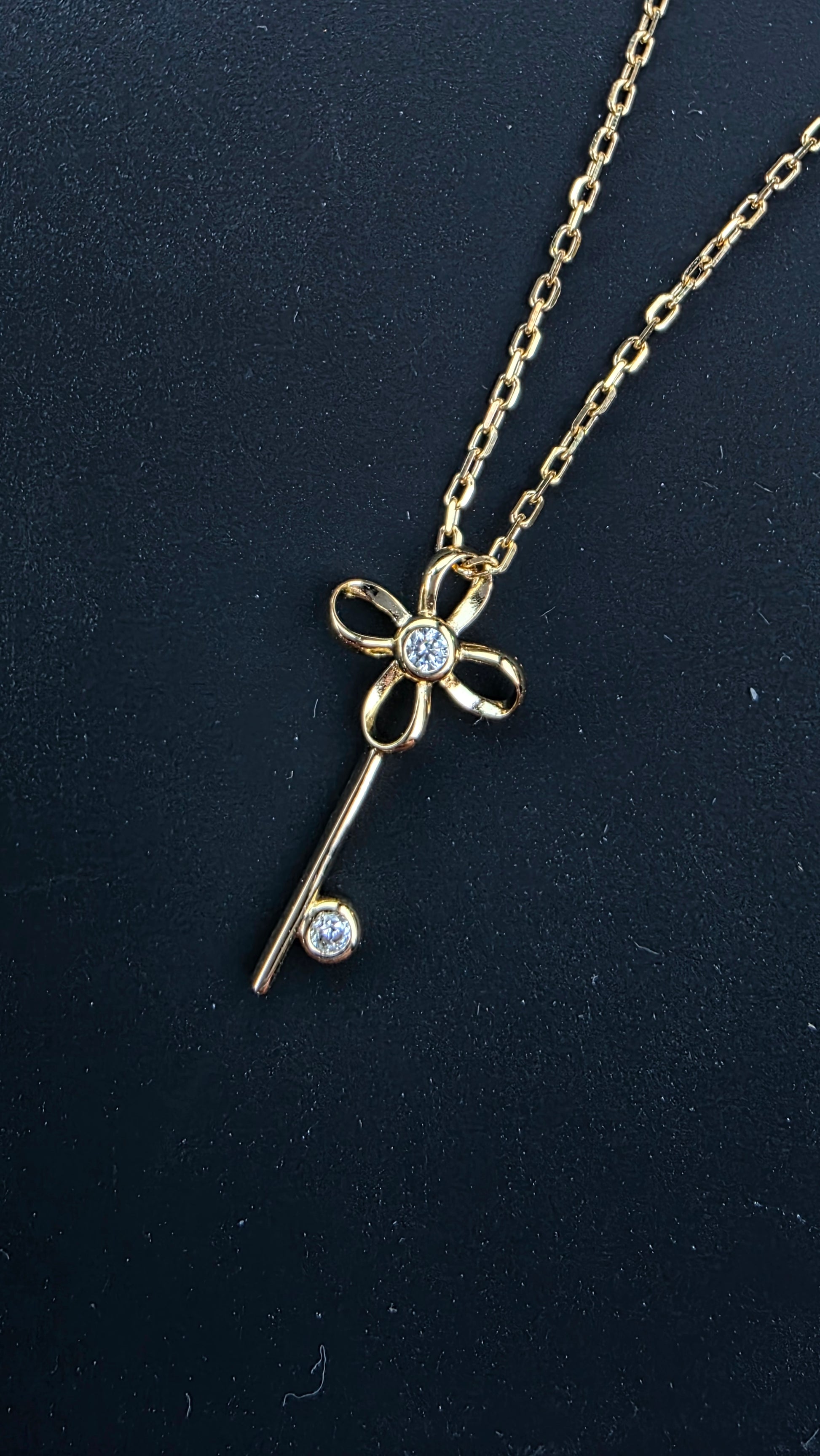 Un diseño delicado y femenino, perfecto para acompañarte todos los días. Este collar está elaborado en plata 925, finamente bañado en oro, y presenta un colgante en forma de llave con un detalle de flor en su extremo superior. Al centro, un cristal brillante aporta luz y elegancia, creando una pieza sutil pero con un encanto especial.