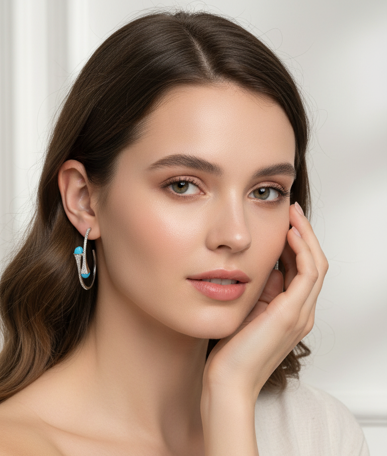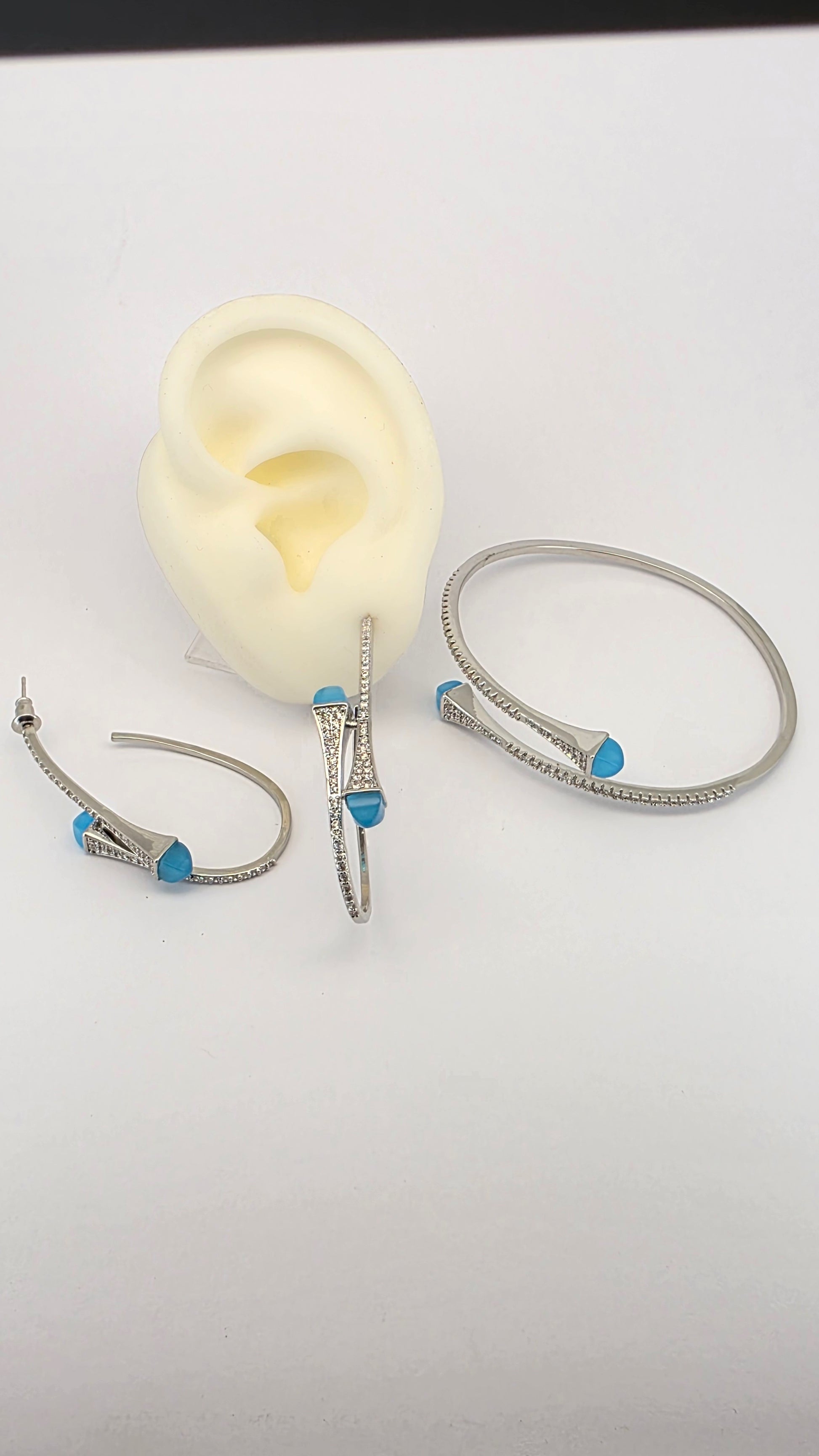 Este elegante conjunto está compuesto por unos aros tipo argolla y un brazalete rígido, ambos elaborados en metal rodinado que aporta un acabado brillante y resistente. El diseño se caracteriza por una línea central de cristales pavé que recorre cada pieza, rematada en ambos extremos por detalles esmaltados en un delicado tono celeste, de forma cónica facetada. Una fusión perfecta entre modernidad y sofisticación, ideal para destacar con estilo en cualquier ocasión.
