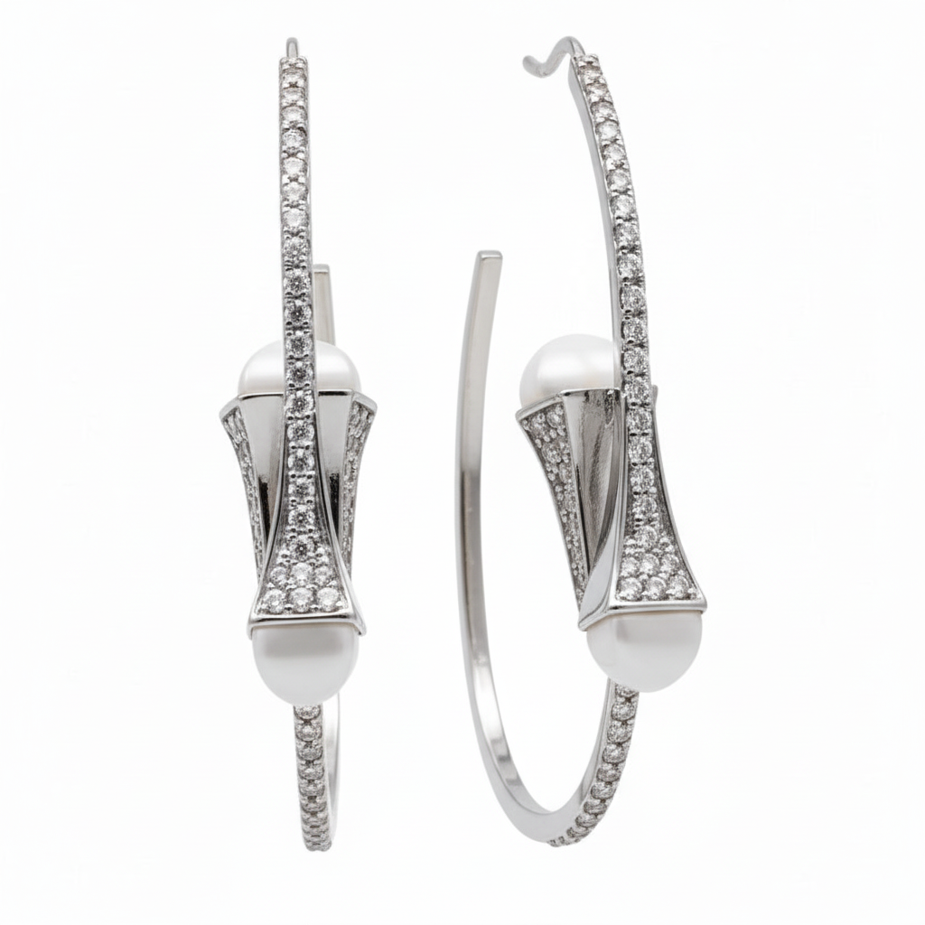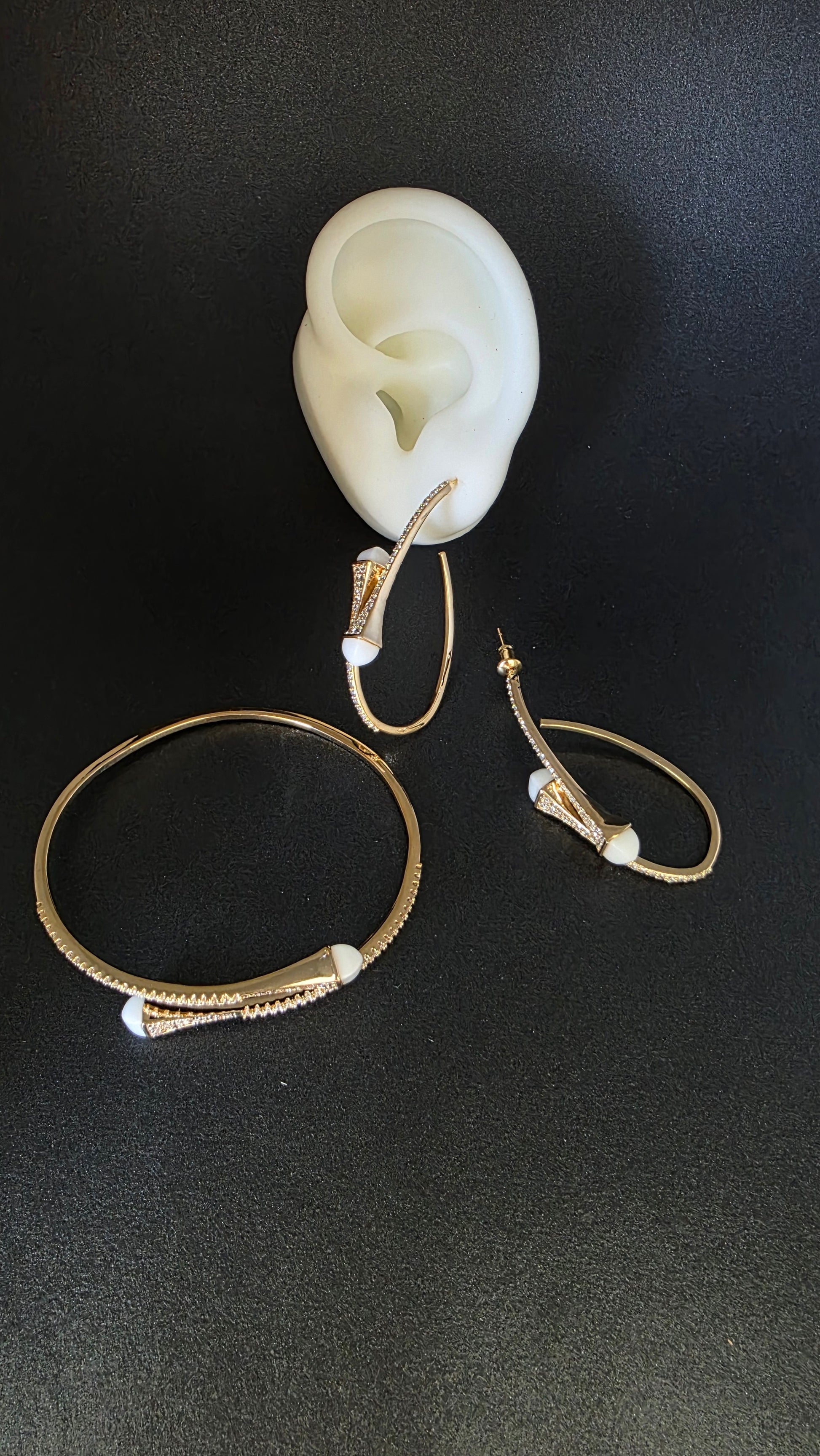 Este elegante conjunto está compuesto por unos aros tipo argolla y un brazalete rígido, ambos elaborados en metal rodinado que aporta un acabado brillante y resistente. El diseño se caracteriza por una línea central de cristales pavé que recorre cada pieza, rematada en ambos extremos por detalles esmaltados en un delicado tono marfil de forma cónica facetada. Una fusión perfecta entre modernidad y sofisticación, ideal para destacar con estilo en cualquier ocasión.