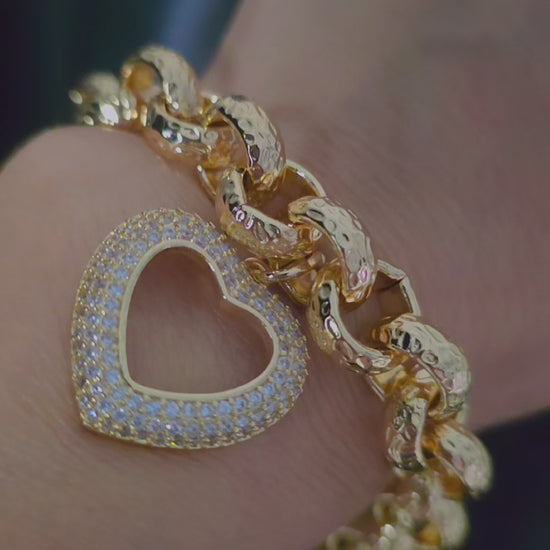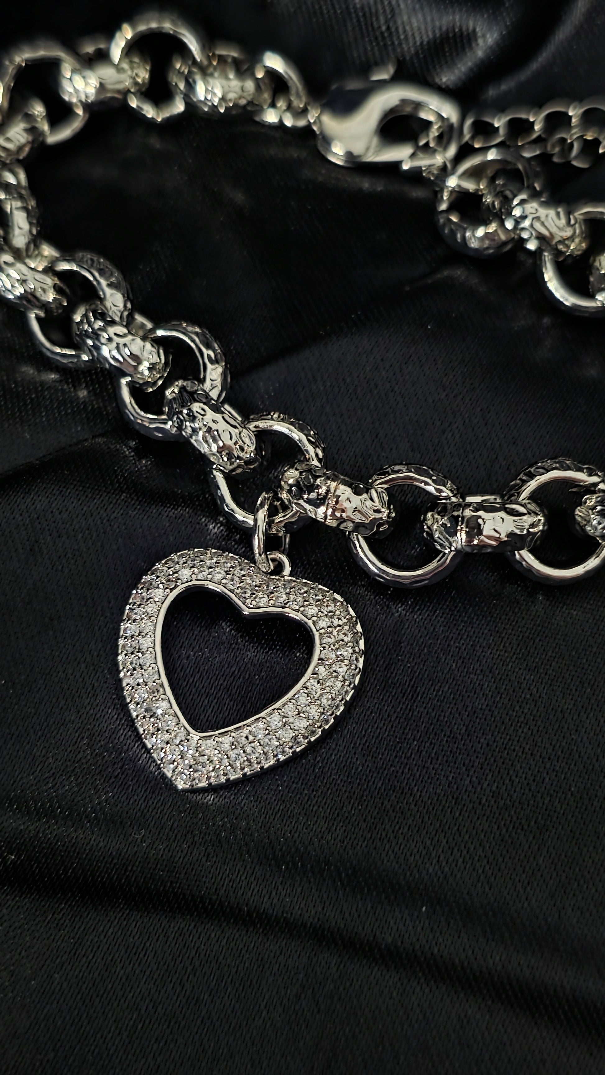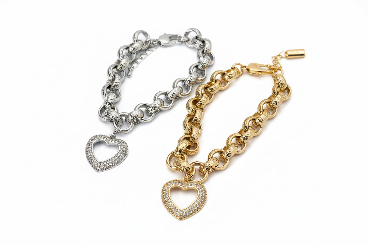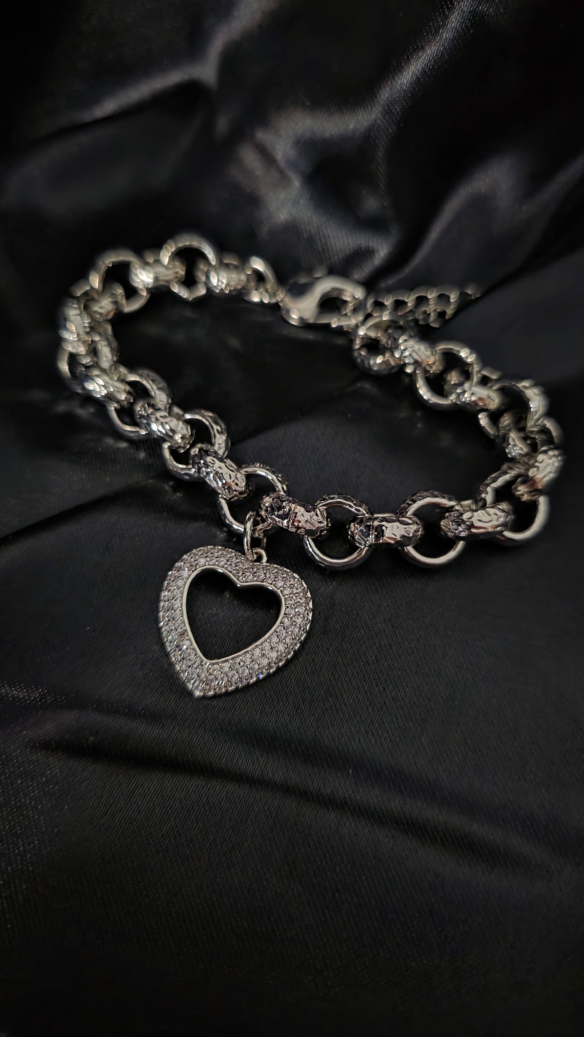 Pulsera de diseño elegante y contemporáneo, compuesta por eslabones de cadena y un corazón central engastado en cristales pavé. Cada cristal va cuidadosamente engarzado uno a uno, logrando un brillo uniforme y sofisticado. Su terminación con baño de rodio realza el acabado y aporta mayor durabilidad. Una joya fina, protagonista y atemporal, ideal para destacar la muñeca con un toque de luz y romanticismo, que requiere cuidados especiales para conservar su belleza en el tiempo.