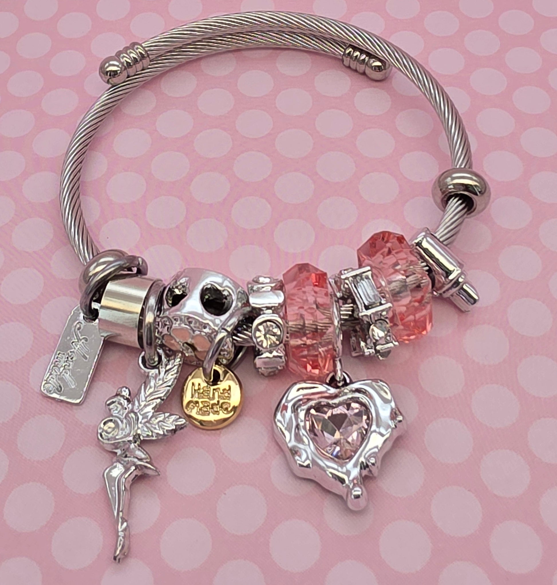 Pulsera de acero con dijes de baño de rodio ajustable. Diseños para las mini lobos que quieran tener su primera joya.